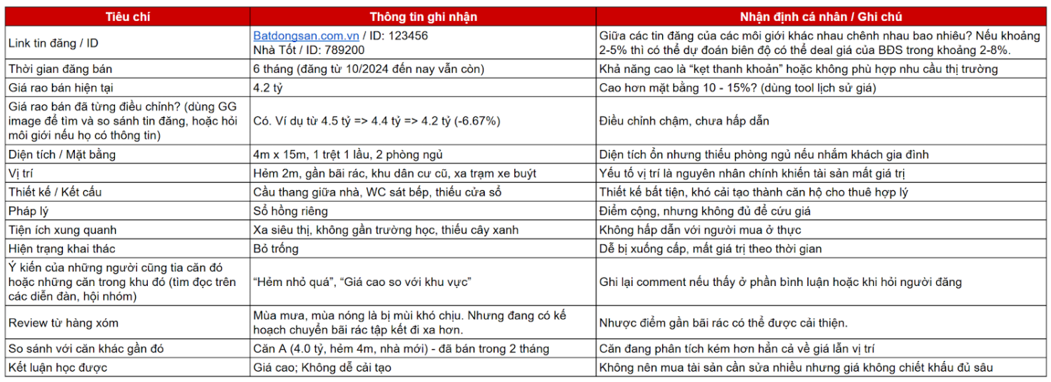 Bước 2 - So sánh và phân loại: Lập bảng so sánh "xấu vì sao?" Mô tả sơ bộ về vị trí, diện tích, giá, thiết kế, pháp lý;.... Tự hỏi bản thân xem nếu mình là người mua, mình thấy khó chịu ở điểm nào? Nếu mình là người cải tạo lại, mình sẽ làm gì? Có đáng tiền không? Đồng thời hỏi thăm môi giới về các căn này.
