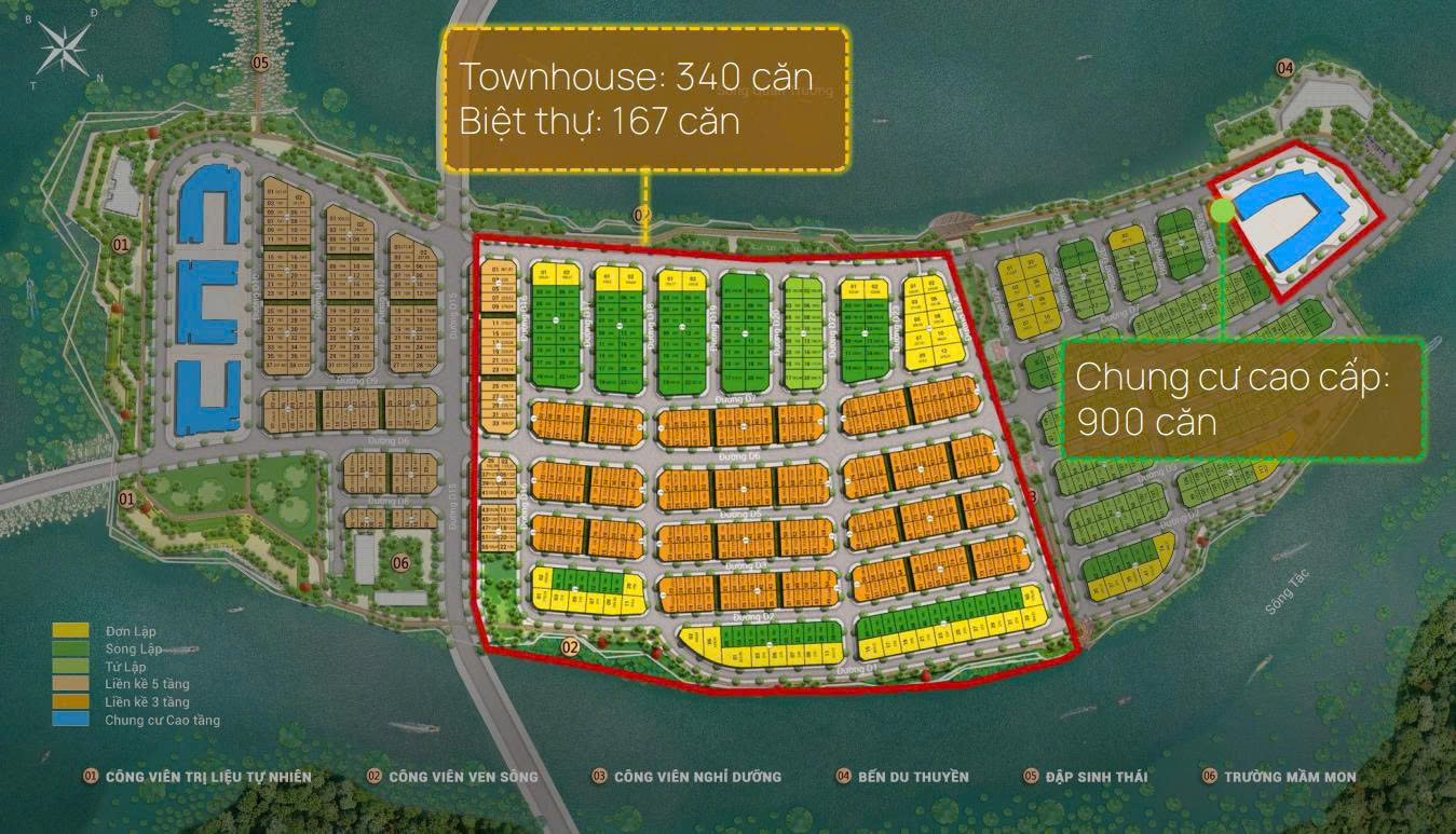 Số lượng và phân khu: ví dụ biệt thự xanh nội khu có khoảng 167 căn.